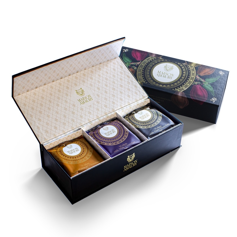 The Maison Amaury Chocolate Wafer Box offers an exquisite selection of wafers delicately filled with the refined flavors of white chocolate, milk chocolate, and dark chocolate. Each wafer provides a unique tasting experience, combining the crunchiness of the biscuit with the smooth richness of the chocolate. With 8 wafers per flavor, for a total of 24 wafers, this box is the perfect embodiment of indulgence, ideal for sharing or gifting.